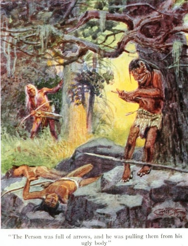 "'That is strange,' said Old-man; 'how can one Person kill so many men? Who is this Person, tell me his name!' but the man didn't answer—he was dead. When Old-man saw that life had left the wounded man, he drank from the spring, and went on toward the north, but before long he heard a noise as of men fighting, and he stopped to look and listen. Finally he saw the bushes bend and sway near a creek that flowed through the forest. He crawled toward the spot, and peering through the brush saw a great Person near a pile of dead men, with his back against a pine-tree. The Person was full of arrows, and he was pulling them from his ugly body. Calmly the Person broke the shafts of the arrows, tossed them aside, and stopped the blood flow with a brush of his hairy hand. He head was large and fierce-looking, and his eyes were small and wicked. His great body was larger than that of a buffalo-bull and covered with scars of many battles.