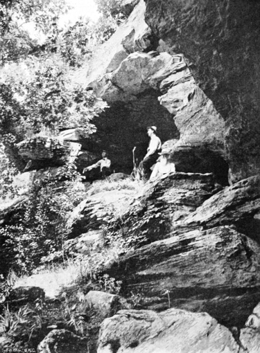 One of these caves, the largest in the region, had long been the favorite haunt of the Indians, and the number and variety of the inscriptions would indicate that their visits had been frequent and prolonged. Large, deep furrows in the soft sandstone at the mouth of the cave show where the warriors were accumtomed[sic] to whet their spikes and arrow heads. Just inside of the cave, on the right hand, were to be seen three warriors, decked with war paint and feathers, and above and around them were many inscriptions and characters. In other parts of the cave there were representations of warriors grappling with bears and other wild beasts. There were also turtles and fish of different sizes and shapes; warriors swimming in the river; some leading ponies and others carrying bows and arrows. In the background was a lone warrior, wrapped in a blanket; this inscription is supposed to have been engraved by Monegaw, himself, and to be representative of his own death.