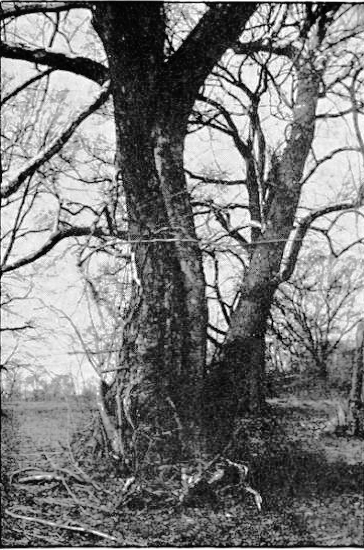 The process of reducing the ore was in keeping with the rude life they lived and with the type of civilization they represented. In a secret ravine they discovered an immense oak tree which was hollow for its entire length; this was the Indian smelter. About twenty feet from the ground limbs jutted out in three directions. Branches were cut and placed across these out-spreading arms so as to form a substantial platform. Just above the platform the Indians cut an opening which communicated with the hollow interior. By means of ropes made of twisted strands of buffalo hides, the bags of ore were lifted from the ponies' backs to the platform above. The ore, together with layers of dry wood, was placed in the hollow until it was completely filled. The mass was then set on fire from an opening made near the ground and allowed to burn. By this process the lead was melted from the ore and ran down in the ashes at the foot of the tree. After cooling it was taken out and molded into the bullets which were to bring death to the white man.